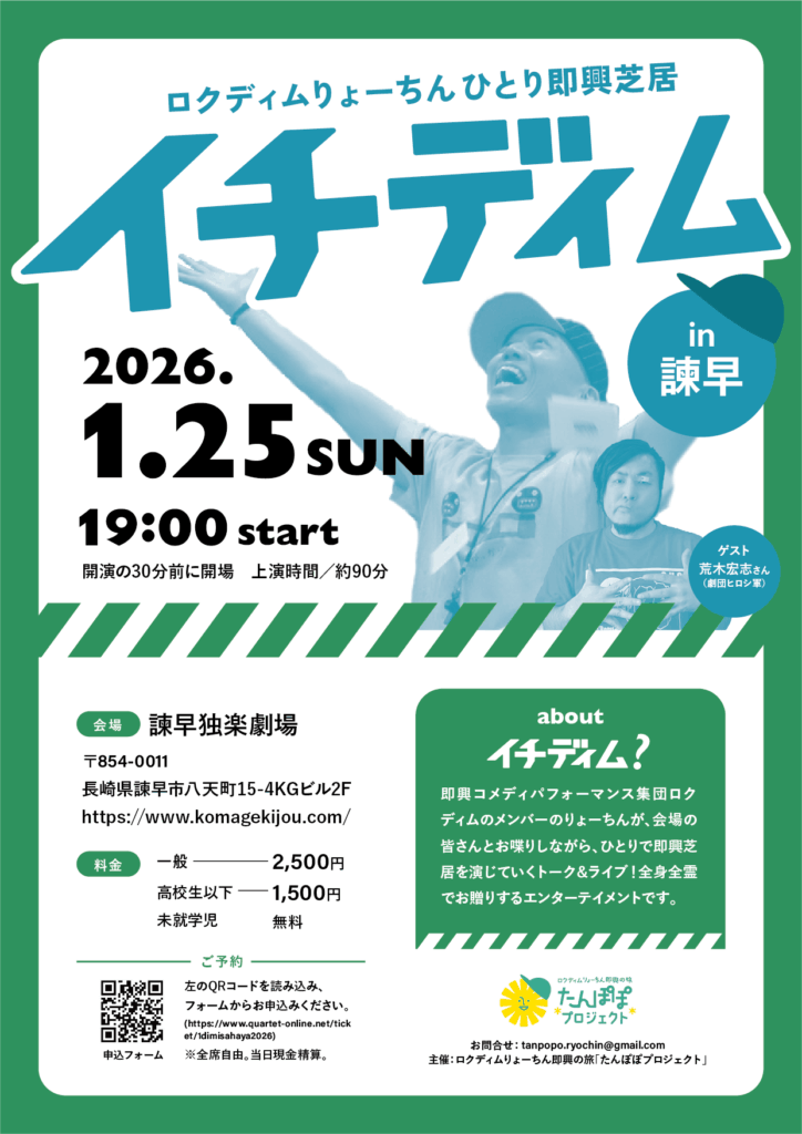| イーズスケッチ第3期WS 7:00 pm イーズスケッチ第3期WS 1月 20 @ 7:00 pm – 9:30 pm ![]() 🗓 開催概要 ・期間:1月13日(火)〜3月31日(火)/全10回 (2月10日火曜、3月24日火曜はお休み) ・曜日:毎週火曜 ・時間:19:00〜21:30(開場18:45) ・会場:世田谷区内施設(申込後にご案内) ・定員:6名程度 💰 参加費 ・1回参加:2,500円 ・全回参加:22,500円 ・全回早割:20,000円(1/5まで) ⸻ 「即興って、こんなに興味深いんだ」 「自分を使うって、こういうことかもしれない」 そんな感覚を、 一緒にじっくり育てていけたら嬉しいです。 📩 お申し込みは 申込フォーム、または りょーちん宛にメッセージでどうぞ。 https://forms.gle/3BEkMcEJkLXChtnJ9 | 佐世保WS 佐世保WS 1月 24 終日 ![]() 【1/24(土)は長崎・佐世保へ! 午後はワークショップ、夜はひとり即興芝居「イチディム」!】 たんぽぽプロジェクト、2026年の始まりは長崎県佐世保市から。 会場はどちらも「させぼガレージ劇場」。 午後はじっくり即興ワークショップ、夜はゲストを迎えてのイチディム公演。 1日まるごと、即興の時間をご一緒できたら嬉しいです。 🎁 昼・夜どちらも参加される方は、合計金額から《500円引き》になります! ━━━━━━━━━━━━━━━ ◆ 即興ワークショップ in 佐世保 ━━━━━━━━━━━━━━━ テーマ:楽に、楽しく、興味深く ― 即興するためのワークショップ 即興というと、「難しそう」と感じる人もいれば、 「なんでもしていい」と思う人もいます。 でも本当は、どちらでもありません。 即興は、“今の自分に合わせていくこと”。 自分がただそのまま、そこにいればいい。 そこからすべてが始まっていきます。 自分にあるものを使っていけたら、 それは自然と“楽”で、“楽しくて”、そして“興味深い”体験になります。 難しく感じたり、楽しめなくなったりするのは、 意識が相手やストーリーのほうに向きすぎてしまうから。 このワークショップでは、 「自分に合わせる」ことをとことん実践していきます。 自分を起点にすることで、 相手と一緒に“楽に、楽しく、興味深く”シーンをつくっていける。 その感覚を、じっくり体験してもらいます。 🔽日時 2026年1月24日(土)13:00~17:00 🔽会場 させぼガレージ劇場 〒857-0041 長崎県佐世保市木場田町8-7 https://withrungarage.com/ ※専用の駐車場はございません。 🔽料金 一般:4,000円 25歳以下:2,000円 🔻お申し込みはこちら https://www.quartet-online.net/ticket/1dimwssasebo ※当日現金精算 ━━━━━━━━━━━━━━━ ◆ ひとり即興芝居「イチディム」in 佐世保 ━━━━━━━━━━━━━━━ 夜は、ひとりで全部の役を演じる即興芝居「イチディム」。 佐世保公演では、劇団HIT!STAGEの 森タカコさん をゲストにお迎えします。 お客さんとのやりとりから生まれる“その日その場だけ”の物語を、一緒に味わってもらえたら嬉しいです。 🔽タイトル ロクディムりょーちん ひとり即興芝居「イチディム」in 佐世保! 🔽ゲスト 森タカコ(劇団HIT!STAGE) 🔽日時 2026年1月24日(土)18:30開演 ※開場は開演の30分前 ※公演時間:約90分 🔽会場 させぼガレージ劇場 〒857-0041 長崎県佐世保市木場田町8-7 https://withrungarage.com/ ※専用の駐車場はございません。 🔽チケット 一般:2,500円 高校生以下:1,500円 未就学児:無料 🔻ご予約はこちら https://www.quartet-online.net/ticket/1dimwssasebo ※全席自由/当日現金精算 ━━━━━━━━━━━━━━━ ワークショップだけの参加も、イチディムだけの観劇も、 もちろん “昼も夜もまるっと参加” も大歓迎です。 両方参加される方は《500円引き》になります! 佐世保のみなさん、お近くのみなさん、 ぜひ会いに・遊びに・笑いに来てください。 お会いできるのを楽しみにしています! <主催・お問い合わせ> ロクディムりょーちん即興の旅「たんぽぽプロジェクト」 tanpopo.ryochin★gmail.com(★を@に変えて送信ください) 佐世保イチディム 佐世保イチディム 1月 24 終日 ![]() 【1/24(土)は長崎・佐世保へ! 午後はワークショップ、夜はひとり即興芝居「イチディム」!】 たんぽぽプロジェクト、2026年の始まりは長崎県佐世保市から。 会場はどちらも「させぼガレージ劇場」。 午後はじっくり即興ワークショップ、夜はゲストを迎えてのイチディム公演。 1日まるごと、即興の時間をご一緒できたら嬉しいです。 🎁 昼・夜どちらも参加される方は、合計金額から《500円引き》になります! ━━━━━━━━━━━━━━━ ◆ 即興ワークショップ in 佐世保 ━━━━━━━━━━━━━━━ テーマ:楽に、楽しく、興味深く ― 即興するためのワークショップ 即興というと、「難しそう」と感じる人もいれば、 「なんでもしていい」と思う人もいます。 でも本当は、どちらでもありません。 即興は、“今の自分に合わせていくこと”。 自分がただそのまま、そこにいればいい。 そこからすべてが始まっていきます。 自分にあるものを使っていけたら、 それは自然と“楽”で、“楽しくて”、そして“興味深い”体験になります。 難