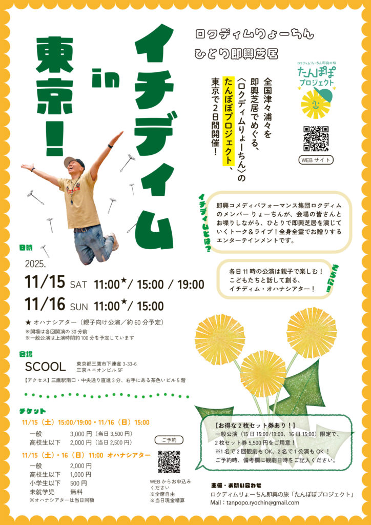 | イーズスケッチ第3期WS 7:00 pm イーズスケッチ第3期WS 1月 20 @ 7:00 pm – 9:30 pm ![]() 🗓 開催概要 ・期間:1月13日(火)〜3月31日(火)/全10回 (2月10日火曜、3月24日火曜はお休み) ・曜日:毎週火曜 ・時間:19:00〜21:30(開場18:45) ・会場:世田谷区内施設(申込後にご案内) ・定員:6名程度 💰 参加費 ・1回参加:2,500円 ・全回参加:22,500円 ・全回早割:20,000円(1/5まで) ⸻ 「即興って、こんなに興味深いんだ」 「自分を使うって、こういうことかもしれない」 そんな感覚を、 一緒にじっくり育てていけたら嬉しいです。 📩 お申し込みは 申込フォーム、または りょーちん宛にメッセージでどうぞ。 https://forms.gle/3BEkMcEJkLXChtnJ9 | 佐世保WS 佐世保WS 1月 24 終日 ![]() 【1/24(土)は長崎・佐世保へ! 午後はワークショップ、夜はひとり即興芝居「イチディム」!】 たんぽぽプロジェクト、2026年の始まりは長崎県佐世保市から。 会場はどちらも「させぼガレージ劇場」。 午後はじっくり即興ワークショップ、夜はゲストを迎えてのイチディム公演。 1日まるごと、即興の時間をご一緒できたら嬉しいです。 🎁 昼・夜どちらも参加される方は、合計金額から《500円引き》になります! ━━━━━━━━━━━━━━━ ◆ 即興ワークショップ in 佐世保 ━━━━━━━━━━━━━━━ テーマ:楽に、楽しく、興味深く ― 即興するためのワークショップ 即興というと、「難しそう」と感じる人もいれば、 「なんでもしていい」と思う人もいます。 でも本当は、どちらでもありません。 即興は、“今の自分に合わせていくこと”。 自分がただそのまま、そこにいればいい。 そこからすべてが始まっていきます。 自分にあるものを使っていけたら、 それは自然と“楽”で、“楽しくて”、そして“興味深い”体験になります。 難しく感じたり、楽しめなくなったりするのは、 意識が相手やストーリーのほうに向きすぎてしまうから。 このワークショップでは、 「自分に合わせる」ことをとことん実践していきます。 自分を起点にすることで、 相手と一緒に“楽に、楽しく、興味深く”シーンをつくっていける。 その感覚を、じっくり体験してもらいます。 🔽日時 2026年1月24日(土)13:00~17:00 🔽会場 させぼガレージ劇場 〒857-0041 長崎県佐世保市木場田町8-7 https://withrungarage.com/ ※専用の駐車場はございません。 🔽料金 一般:4,000円 25歳以下:2,000円 🔻お申し込みはこちら https://www.quartet-online.net/ticket/1dimwssasebo ※当日現金精算 ━━━━━━━━━━━━━━━ ◆ ひとり即興芝居「イチディム」in 佐世保 ━━━━━━━━━━━━━━━ 夜は、ひとりで全部の役を演じる即興芝居「イチディム」。 佐世保公演では、劇団HIT!STAGEの 森タカコさん をゲストにお迎えします。 お客さんとのやりとりから生まれる“その日その場だけ”の物語を、一緒に味わってもらえたら嬉しいです。 🔽タイトル ロクディムりょーちん ひとり即興芝居「イチディム」in 佐世保! 🔽ゲスト 森タカコ(劇団HIT!STAGE) 🔽日時 2026年1月24日(土)18:30開演 ※開場は開演の30分前 ※公演時間:約90分 🔽会場 させぼガレージ劇場 〒857-0041 長崎県佐世保市木場田町8-7 https://withrungarage.com/ ※専用の駐車場はございません。 🔽チケット 一般:2,500円 高校生以下:1,500円 未就学児:無料 🔻ご予約はこちら https://www.quartet-online.net/ticket/1dimwssasebo ※全席自由/当日現金精算 ━━━━━━━━━━━━━━━ ワークショップだけの参加も、イチディムだけの観劇も、 もちろん “昼も夜もまるっと参加” も大歓迎です。 両方参加される方は《500円引き》になります! 佐世保のみなさん、お近くのみなさん、 ぜひ会いに・遊びに・笑いに来てください。 お会いできるのを楽しみにしています! <主催・お問い合わせ> ロクディムりょーちん即興の旅「たんぽぽプロジェクト」 tanpopo.ryochin★gmail.com(★を@に変えて送信ください) 佐世保イチディム 佐世保イチディム 1月 24 終日 ![]() 【1/24(土)は長崎・佐世保へ! 午後はワークショップ、夜はひとり即興芝居「イチディム」!】 たんぽぽプロジェクト、2026年の始まりは長崎県佐世保市から。 会場はどちらも「させぼガレージ劇場」。 午後はじっくり即興ワークショップ、夜はゲストを迎えてのイチディム公演。 1日まるごと、即興の時間をご一緒できたら嬉しいです。 🎁 昼・夜どちらも参加される方は、合計金額から《500円引き》になります! ━━━━━━━━━━━━━━━ ◆ 即興ワークショップ in 佐世保 ━━━━━━━━━━━━━━━ テーマ:楽に、楽しく、興味深く ― 即興するためのワークショップ 即興というと、「難しそう」と感じる人もいれば、 「なんでもしていい」と思う人もいます。 でも本当は、どちらでもありません。 即興は、“今の自分に合わせていくこと”。 自分がただそのまま、そこにいればいい。 そこからすべてが始まっていきます。 自分にあるものを使っていけたら、 それは自然と“楽”で、“楽しくて”、そして“興味深い”体験になります。 難