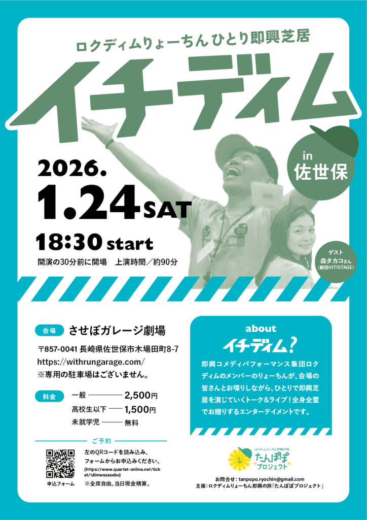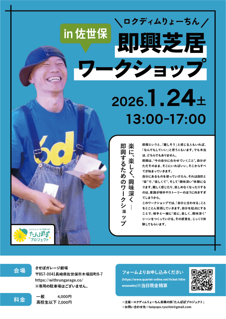 | イーズスケッチ第3期WS 7:00 pm イーズスケッチ第3期WS 1月 20 @ 7:00 pm – 9:30 pm ![]() 🗓 開催概要 ・期間:1月13日(火)〜3月31日(火)/全10回 (2月10日火曜、3月24日火曜はお休み) ・曜日:毎週火曜 ・時間:19:00〜21:30(開場18:45) ・会場:世田谷区内施設(申込後にご案内) ・定員:6名程度 💰 参加費 ・1回参加:2,500円 ・全回参加:22,500円 ・全回早割:20,000円(1/5まで) ⸻ 「即興って、こんなに興味深いんだ」 「自分を使うって、こういうことかもしれない」 そんな感覚を、 一緒にじっくり育てていけたら嬉しいです。 📩 お申し込みは 申込フォーム、または りょーちん宛にメッセージでどうぞ。 https://forms.gle/3BEkMcEJkLXChtnJ9 | 佐世保WS 佐世保WS 1月 24 終日 ![]() 【1/24(土)は長崎・佐世保へ! 午後はワークショップ、夜はひとり即興芝居「イチディム」!】 たんぽぽプロジェクト、2026年の始まりは長崎県佐世保市から。 会場はどちらも「させぼガレージ劇場」。 午後はじっくり即興ワークショップ、夜はゲストを迎えてのイチディム公演。 1日まるごと、即興の時間をご一緒できたら嬉しいです。 🎁 昼・夜どちらも参加される方は、合計金額から《500円引き》になります! ━━━━━━━━━━━━━━━ ◆ 即興ワークショップ in 佐世保 ━━━━━━━━━━━━━━━ テーマ:楽に、楽しく、興味深く ― 即興するためのワークショップ 即興というと、「難しそう」と感じる人もいれば、 「なんでもしていい」と思う人もいます。 でも本当は、どちらでもありません。 即興は、“今の自分に合わせていくこと”。 自分がただそのまま、そこにいればいい。 そこからすべてが始まっていきます。 自分にあるものを使っていけたら、 それは自然と“楽”で、“楽しくて”、そして“興味深い”体験になります。 難しく感じたり、楽しめなくなったりするのは、 意識が相手やストーリーのほうに向きすぎてしまうから。 このワークショップでは、 「自分に合わせる」ことをとことん実践していきます。 自分を起点にすることで、 相手と一緒に“楽に、楽しく、興味深く”シーンをつくっていける。 その感覚を、じっくり体験してもらいます。 🔽日時 2026年1月24日(土)13:00~17:00 🔽会場 させぼガレージ劇場 〒857-0041 長崎県佐世保市木場田町8-7 https://withrungarage.com/ ※専用の駐車場はございません。 🔽料金 一般:4,000円 25歳以下:2,000円 🔻お申し込みはこちら https://www.quartet-online.net/ticket/1dimwssasebo ※当日現金精算 ━━━━━━━━━━━━━━━ ◆ ひとり即興芝居「イチディム」in 佐世保 ━━━━━━━━━━━━━━━ 夜は、ひとりで全部の役を演じる即興芝居「イチディム」。 佐世保公演では、劇団HIT!STAGEの 森タカコさん をゲストにお迎えします。 お客さんとのやりとりから生まれる“その日その場だけ”の物語を、一緒に味わってもらえたら嬉しいです。 🔽タイトル ロクディムりょーちん ひとり即興芝居「イチディム」in 佐世保! 🔽ゲスト 森タカコ(劇団HIT!STAGE) 🔽日時 2026年1月24日(土)18:30開演 ※開場は開演の30分前 ※公演時間:約90分 🔽会場 させぼガレージ劇場 〒857-0041 長崎県佐世保市木場田町8-7 https://withrungarage.com/ ※専用の駐車場はございません。 🔽チケット 一般:2,500円 高校生以下:1,500円 未就学児:無料 🔻ご予約はこちら https://www.quartet-online.net/ticket/1dimwssasebo ※全席自由/当日現金精算 ━━━━━━━━━━━━━━━ ワークショップだけの参加も、イチディムだけの観劇も、 もちろん “昼も夜もまるっと参加” も大歓迎です。 両方参加される方は《500円引き》になります! 佐世保のみなさん、お近くのみなさん、 ぜひ会いに・遊びに・笑いに来てください。 お会いできるのを楽しみにしています! <主催・お問い合わせ> ロクディムりょーちん即興の旅「たんぽぽプロジェクト」 tanpopo.ryochin★gmail.com(★を@に変えて送信ください) 佐世保イチディム 佐世保イチディム 1月 24 終日 ![]() 【1/24(土)は長崎・佐世保へ! 午後はワークショップ、夜はひとり即興芝居「イチディム」!】 たんぽぽプロジェクト、2026年の始まりは長崎県佐世保市から。 会場はどちらも「させぼガレージ劇場」。 午後はじっくり即興ワークショップ、夜はゲストを迎えてのイチディム公演。 1日まるごと、即興の時間をご一緒できたら嬉しいです。 🎁 昼・夜どちらも参加される方は、合計金額から《500円引き》になります! ━━━━━━━━━━━━━━━ ◆ 即興ワークショップ in 佐世保 ━━━━━━━━━━━━━━━ テーマ:楽に、楽しく、興味深く ― 即興するためのワークショップ 即興というと、「難しそう」と感じる人もいれば、 「なんでもしていい」と思う人もいます。 でも本当は、どちらでもありません。 即興は、“今の自分に合わせていくこと”。 自分がただそのまま、そこにいればいい。 そこからすべてが始まっていきます。 自分にあるものを使っていけたら、 それは自然と“楽”で、“楽しくて”、そして“興味深い”体験になります。 難