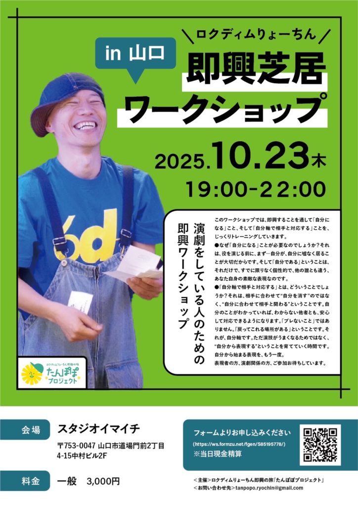 | イーズスケッチ第3期WS 7:00 pm イーズスケッチ第3期WS 1月 20 @ 7:00 pm – 9:30 pm ![]() 🗓 開催概要 ・期間:1月13日(火)〜3月31日(火)/全10回 (2月10日火曜、3月24日火曜はお休み) ・曜日:毎週火曜 ・時間:19:00〜21:30(開場18:45) ・会場:世田谷区内施設(申込後にご案内) ・定員:6名程度 💰 参加費 ・1回参加:2,500円 ・全回参加:22,500円 ・全回早割:20,000円(1/5まで) ⸻ 「即興って、こんなに興味深いんだ」 「自分を使うって、こういうことかもしれない」 そんな感覚を、 一緒にじっくり育てていけたら嬉しいです。 📩 お申し込みは 申込フォーム、または りょーちん宛にメッセージでどうぞ。 https://forms.gle/3BEkMcEJkLXChtnJ9 | 佐世保WS 佐世保WS 1月 24 終日 ![]() 【1/24(土)は長崎・佐世保へ! 午後はワークショップ、夜はひとり即興芝居「イチディム」!】 たんぽぽプロジェクト、2026年の始まりは長崎県佐世保市から。 会場はどちらも「させぼガレージ劇場」。 午後はじっくり即興ワークショップ、夜はゲストを迎えてのイチディム公演。 1日まるごと、即興の時間をご一緒できたら嬉しいです。 🎁 昼・夜どちらも参加される方は、合計金額から《500円引き》になります! ━━━━━━━━━━━━━━━ ◆ 即興ワークショップ in 佐世保 ━━━━━━━━━━━━━━━ テーマ:楽に、楽しく、興味深く ― 即興するためのワークショップ 即興というと、「難しそう」と感じる人もいれば、 「なんでもしていい」と思う人もいます。 でも本当は、どちらでもありません。 即興は、“今の自分に合わせていくこと”。 自分がただそのまま、そこにいればいい。 そこからすべてが始まっていきます。 自分にあるものを使っていけたら、 それは自然と“楽”で、“楽しくて”、そして“興味深い”体験になります。 難しく感じたり、楽しめなくなったりするのは、 意識が相手やストーリーのほうに向きすぎてしまうから。 このワークショップでは、 「自分に合わせる」ことをとことん実践していきます。 自分を起点にすることで、 相手と一緒に“楽に、楽しく、興味深く”シーンをつくっていける。 その感覚を、じっくり体験してもらいます。 🔽日時 2026年1月24日(土)13:00~17:00 🔽会場 させぼガレージ劇場 〒857-0041 長崎県佐世保市木場田町8-7 https://withrungarage.com/ ※専用の駐車場はございません。 🔽料金 一般:4,000円 25歳以下:2,000円 🔻お申し込みはこちら https://www.quartet-online.net/ticket/1dimwssasebo ※当日現金精算 ━━━━━━━━━━━━━━━ ◆ ひとり即興芝居「イチディム」in 佐世保 ━━━━━━━━━━━━━━━ 夜は、ひとりで全部の役を演じる即興芝居「イチディム」。 佐世保公演では、劇団HIT!STAGEの 森タカコさん をゲストにお迎えします。 お客さんとのやりとりから生まれる“その日その場だけ”の物語を、一緒に味わってもらえたら嬉しいです。 🔽タイトル ロクディムりょーちん ひとり即興芝居「イチディム」in 佐世保! 🔽ゲスト 森タカコ(劇団HIT!STAGE) 🔽日時 2026年1月24日(土)18:30開演 ※開場は開演の30分前 ※公演時間:約90分 🔽会場 させぼガレージ劇場 〒857-0041 長崎県佐世保市木場田町8-7 https://withrungarage.com/ ※専用の駐車場はございません。 🔽チケット 一般:2,500円 高校生以下:1,500円 未就学児:無料 🔻ご予約はこちら https://www.quartet-online.net/ticket/1dimwssasebo ※全席自由/当日現金精算 ━━━━━━━━━━━━━━━ ワークショップだけの参加も、イチディムだけの観劇も、 もちろん “昼も夜もまるっと参加” も大歓迎です。 両方参加される方は《500円引き》になります! 佐世保のみなさん、お近くのみなさん、 ぜひ会いに・遊びに・笑いに来てください。 お会いできるのを楽しみにしています! <主催・お問い合わせ> ロクディムりょーちん即興の旅「たんぽぽプロジェクト」 tanpopo.ryochin★gmail.com(★を@に変えて送信ください) 佐世保イチディム 佐世保イチディム 1月 24 終日 ![]() 【1/24(土)は長崎・佐世保へ! 午後はワークショップ、夜はひとり即興芝居「イチディム」!】 たんぽぽプロジェクト、2026年の始まりは長崎県佐世保市から。 会場はどちらも「させぼガレージ劇場」。 午後はじっくり即興ワークショップ、夜はゲストを迎えてのイチディム公演。 1日まるごと、即興の時間をご一緒できたら嬉しいです。 🎁 昼・夜どちらも参加される方は、合計金額から《500円引き》になります! ━━━━━━━━━━━━━━━ ◆ 即興ワークショップ in 佐世保 ━━━━━━━━━━━━━━━ テーマ:楽に、楽しく、興味深く ― 即興するためのワークショップ 即興というと、「難しそう」と感じる人もいれば、 「なんでもしていい」と思う人もいます。 でも本当は、どちらでもありません。 即興は、“今の自分に合わせていくこと”。 自分がただそのまま、そこにいればいい。 そこからすべてが始まっていきます。 自分にあるものを使っていけたら、 それは自然と“楽”で、“楽しくて”、そして“興味深い”体験になります。 難