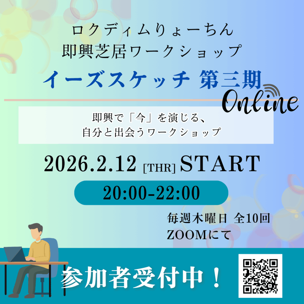 | イーズスケッチ第3期WS 7:00 pm イーズスケッチ第3期WS 1月 13 @ 7:00 pm – 9:30 pm ![]() 🗓 開催概要 ・期間:1月13日(火)〜3月31日(火)/全10回 (2月10日火曜、3月24日火曜はお休み) ・曜日:毎週火曜 ・時間:19:00〜21:30(開場18:45) ・会場:世田谷区内施設(申込後にご案内) ・定員:6名程度 💰 参加費 ・1回参加:2,500円 ・全回参加:22,500円 ・全回早割:20,000円(1/5まで) ⸻ 「即興って、こんなに興味深いんだ」 「自分を使うって、こういうことかもしれない」 そんな感覚を、 一緒にじっくり育てていけたら嬉しいです。 📩 お申し込みは 申込フォーム、または りょーちん宛にメッセージでどうぞ。 https://forms.gle/3BEkMcEJkLXChtnJ9 | イーズスケッチオンラインWS 8:00 pm イーズスケッチオンラインWS 1月 15 @ 8:00 pm – 10:00 pm ![]() 『イーズスケッチ・オンライン 第2期』 即興で“今”を演じる。 うまくやるより、自分を素直に感じて表現する時間。 📅11/13〜1/29(全8回/木曜20時〜) 💻Zoom/定員6名/早割あり(10月末まで) 申込は下記フォームからどうぞ。 ★申込フォーム★ | |||||