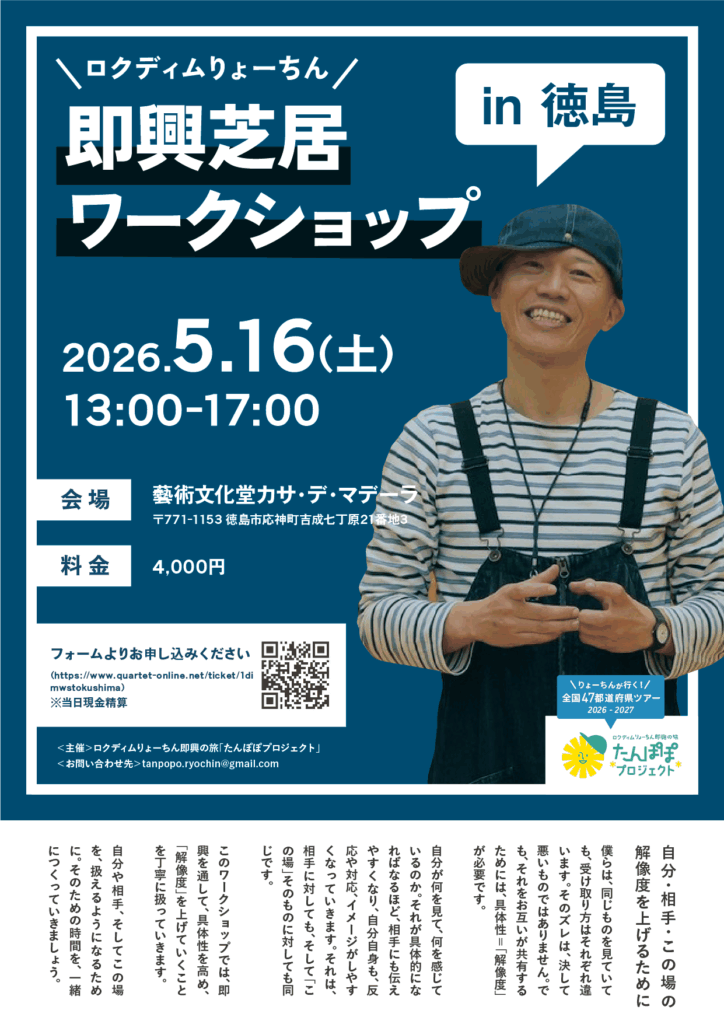 | イーズスケッチ第4期WS 7:00 pm イーズスケッチ第4期WS 4月 14 @ 7:00 pm – 9:30 pm ![]() 【イーズスケッチ 第4期募集 & 第3期ショーイングのお知らせ】 ロクディムりょーちんの即興芝居ワークショップ 「イーズスケッチ」 4月からの第4期の募集と、 現在行っている第3期のショーイング(発表会)のお知らせです。 ⸻ まずは、ショーイングのご案内です。 今、この相手と、この場だからこそ思うこと、感じること。 そのひとつひとつを大切にしながら、相手とシーンを立ち上げていきます。 即興でシーンを演じるって、どんな感じなんだろう? どんな時間が流れているのかな? そんな気持ちで、どうぞ気軽に覗きにいらしてください。 🗓 4月7日(火) 19:30 発表スタート 20:30 終了 20:30〜21:30 振り返り(希望者のみ) 📍 世田谷区内施設 ※お申込みいただいた方に詳細をご案内します 📩 お申し込み りょーちん宛メッセージで。 「行きます」と一言でも大丈夫です。 ⸻ そして、4月14日から イーズスケッチ第4期がスタートします。 今回のテーマは 「解像度 × 表現力」 即興で「今」を演じる。 その瞬間を、もっと具体的に、もっと解像度高く。 これまで大切にしてきた 「自分であること」「今を感じること」を土台にしながら、 そこからもう一歩先へ進むワークをしていきます。 ただ感じるだけで終わらせるのではなく、 それをどう表現し、どう使っていくのか。 シンプルだけど密度の高い時間の中で、 シーンの見え方や、自分の表現を深めていきます。 🗓 第4期 開催概要 ・期間:4月14日(火)〜7月21日(火)/全10回 (4月28日、5月5日、5月19日、6月16日、7月14日はお休み) ・時間:19:00〜21:30 ・会場:世田谷区内施設 ・定員:6名程度 💰 参加費 ・1回参加:3,000円 ・全回参加:30,000円 ・全回早割:25,000円(4/7まで) 📩 お申し込み https://forms.gle/EtPBSbXRZNmoHoFx6 ⸻ 「即興って、こんなに興味深いんだ」 「自分を使うって、こういうことかもしれない」 まずはショーイングでその時間を感じていただいて、 もしよければ、第4期でご一緒できたら嬉しいです。 #即興 #インプロ #芝居 #ワークショップ #東京 | イーズスケッチオンラインWS第3期 8:00 pm イーズスケッチオンラインWS第3期 4月 16 @ 8:00 pm – 10:00 pm ![]() 🗓 開催概要 ・期間:2月12日(木)〜4月23日(木)/全10回 (3月26日火曜はお休み) ・曜日:毎週木曜 ・時間:20:00〜22:00 ・回数:全10回(最終回はショーイング) ・形式:オンライン(Zoom) ※お申込みいただいた方に、参加用URLなどの詳細をお送りします。 ⸻ 💰 参加費 ・1回参加:2,500円 ・全回参加:22,500円 ・全回早割:20,000円(※2月5日まで) ⸻ 🌱 こんな方におすすめです ・即興や表現に興味がある ・自分の気持ちを大切にしたい ・人と関わることを、もう少し楽にしたい ・オンラインで、安心して表現できる場を探している ・画面越しでも「ちゃんとした時間」を味わいたい ⸻ 💬 お申し込み・お問い合わせ 申込フォーム https://forms.gle/vRCWcm3aGCjAsurq5 または りょーちん宛に直接メッセージでどうぞ。 | 60分オンラインWS 8:00 pm 60分オンラインWS 4月 17 @ 8:00 pm – 9:00 pm ![]() こんな方におすすめです ・気づくと、いつも相手に合わせてしまう ・自分の本音が分からなくなることがある ・疲れているけど、何に疲れているのか分からない ・長時間のワークショップはハードルが高い ・まずは短い時間で、自分と向き合ってみたい ⸻ このワークショップの特徴 ・単発参加OK(継続しなくても大丈夫) ・60分だから、生活の中に差し込める ・今の状態のまま参加できます ・少人数(各回4名)でゆっくり進めます これは「学ぶ場」ではありません。 自分を置き去りにしないための、 小さな実践の時間です。 静かだけれど、確かな一歩です。 ⸻ 開催日程 ・4月6日(月)20:00〜21:00 ・4月17日(金)20:00〜21:00 ・4月24日(金)20:00〜21:00 ※必要なタイミングで是非ご参加ください ※5月以降も定期開催予定 ⸻ 定員 各回4名 ⸻ 参加費 3,000円 この60分を、 自分のために“確保する”時間として使ってみてください。 ⸻ 申込方法 Googleフォームよりお申し込みください https://forms.gle/TQ84FXRN3wtvHCvE7 | ||||